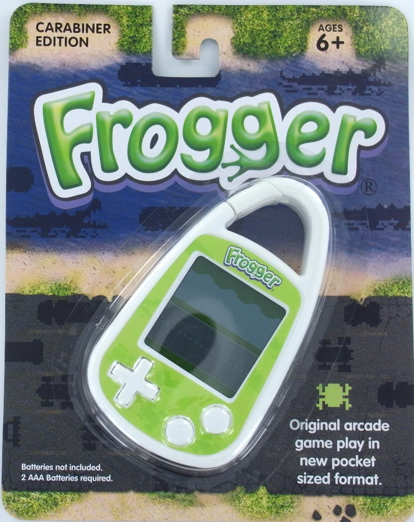 Frogger: Carabiner Edition is an LCD keychain handheld game based on the original arcade version of Frogger. It was published by Basic Fun! under license of Konami and released in 2011.