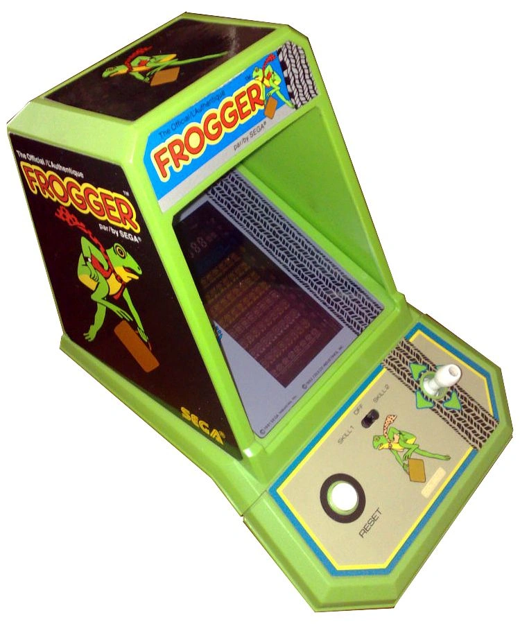 A tabletop mini-arcade cabinet conversion of the 1981 arcade hit video game Frogger, released the same year. The machine is powered by four "C" batteries. The cabinet features the same running Frogger artwork from "The Official Frogger" versions of the game released by Sega, and the screen bezel features artwork that replicates that of the original game for further immersion into the arcade experience. The cabinet features a vertically-oriented color LCD screen and a control panel with a four directional digital joystick and a big white RESET button. Additionally, it has a central switch that allows for two difficulty modes of play –SKILL 1 and SKILL 2–, and an OFF option at the center to turn off the machine.