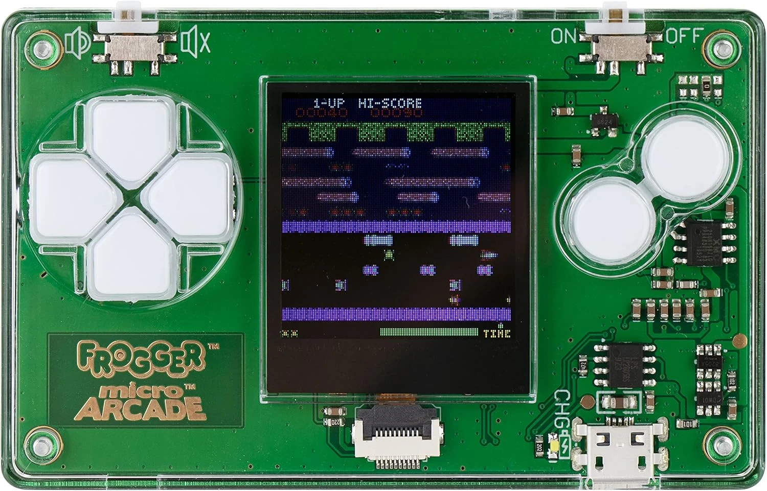 Never before has a full-size arcade game been played in an incredible compact credit card size! Measuring only 3.25 × 2 × .375 of an inch, MicroArcade is the ultimate travel game and easily fits in your pocket! Each game comes with a full color screen, cool sound effects, and directional control buttons, with a micro USB charger included. The MicroArcade games play just like the iconic full-size arcade versions with digitally modified sound effects to fit into the mini flat speaker. Enjoy hours of gameplay without the need for a Wi-Fi connection or data plan! Frogger is now part of the Micro Arcade collection. This arcade classic is addicting and a must-have game for those long commutes. Players must guide Frogger from the bottom of the screen to the home at the top by hopping along perilous roads and rivers.
